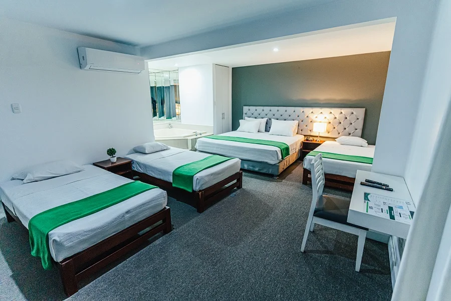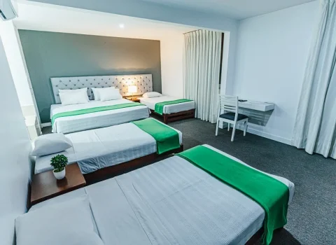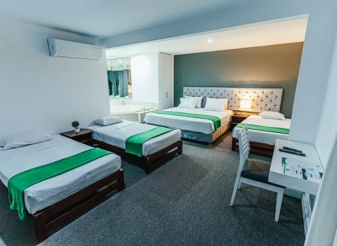 Habitación alfombrada con baño incorporado. Cuenta con 1 Cama King y 3 Camas de 1 ½ plaza.